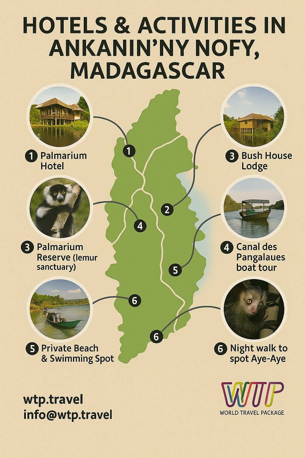 Accès : Généralement accessible en bateau depuis Tamatave (Toamasina) via le canal des Pangalanes – un trajet paisible et pittoresque.