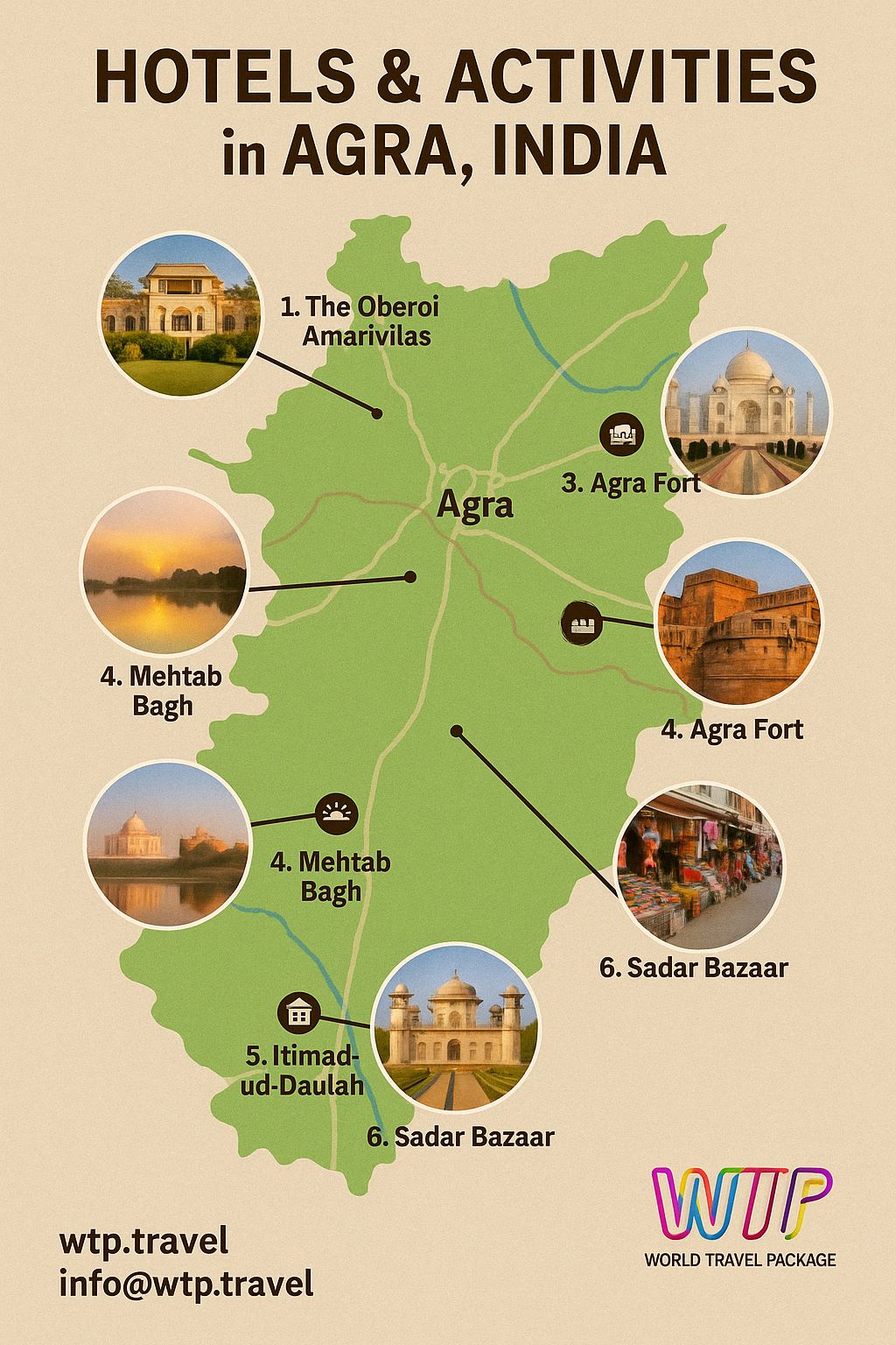 Transport : Auto-rickshaws and taxis are readily available for local travel, while Agra has good train connectivity for reaching nearby cities.