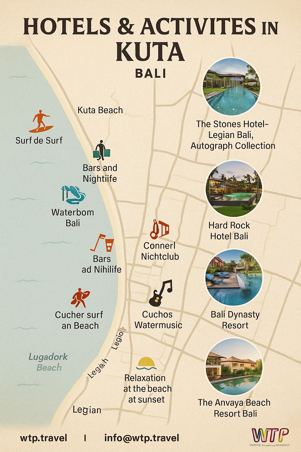 Legian Street: Famous for its vibrant nightlife, bars, clubs, and live music venues. It's the heart of Kuta's party scene, especially popular among younger travelers.