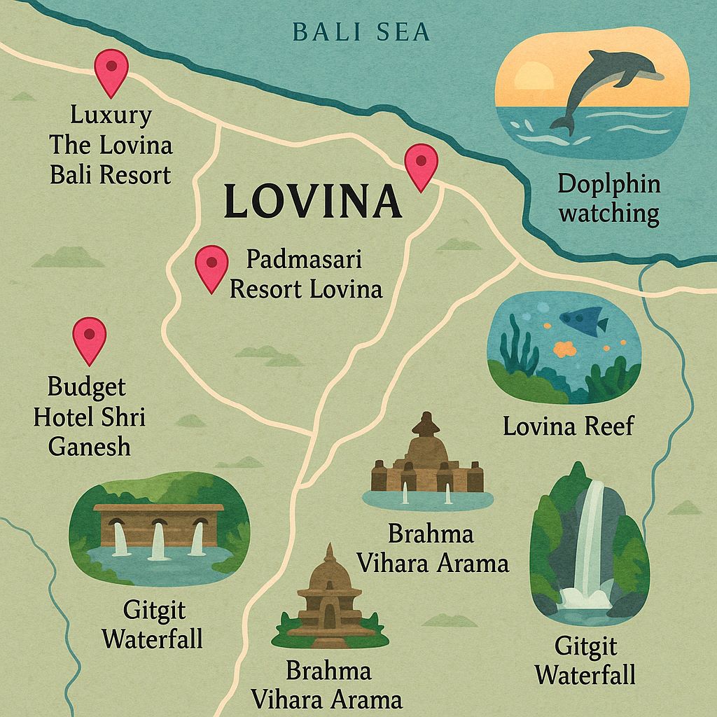 Resorts and Villas: Lovina offers a range of accommodation options from luxury resorts like The Lovina Bali Resort and The Damai to private villas such as Villa Teman and Villa Agung Beach Inn.