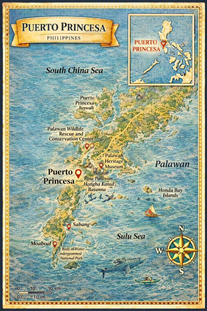 Puerto Princesa, located on the island of Palawan in the Philippines, is known for its stunning natural beauty, pristine beaches, and unique attractions. Here's a comprehensive travel guide to help you explore this vibrant city and its surroundings :