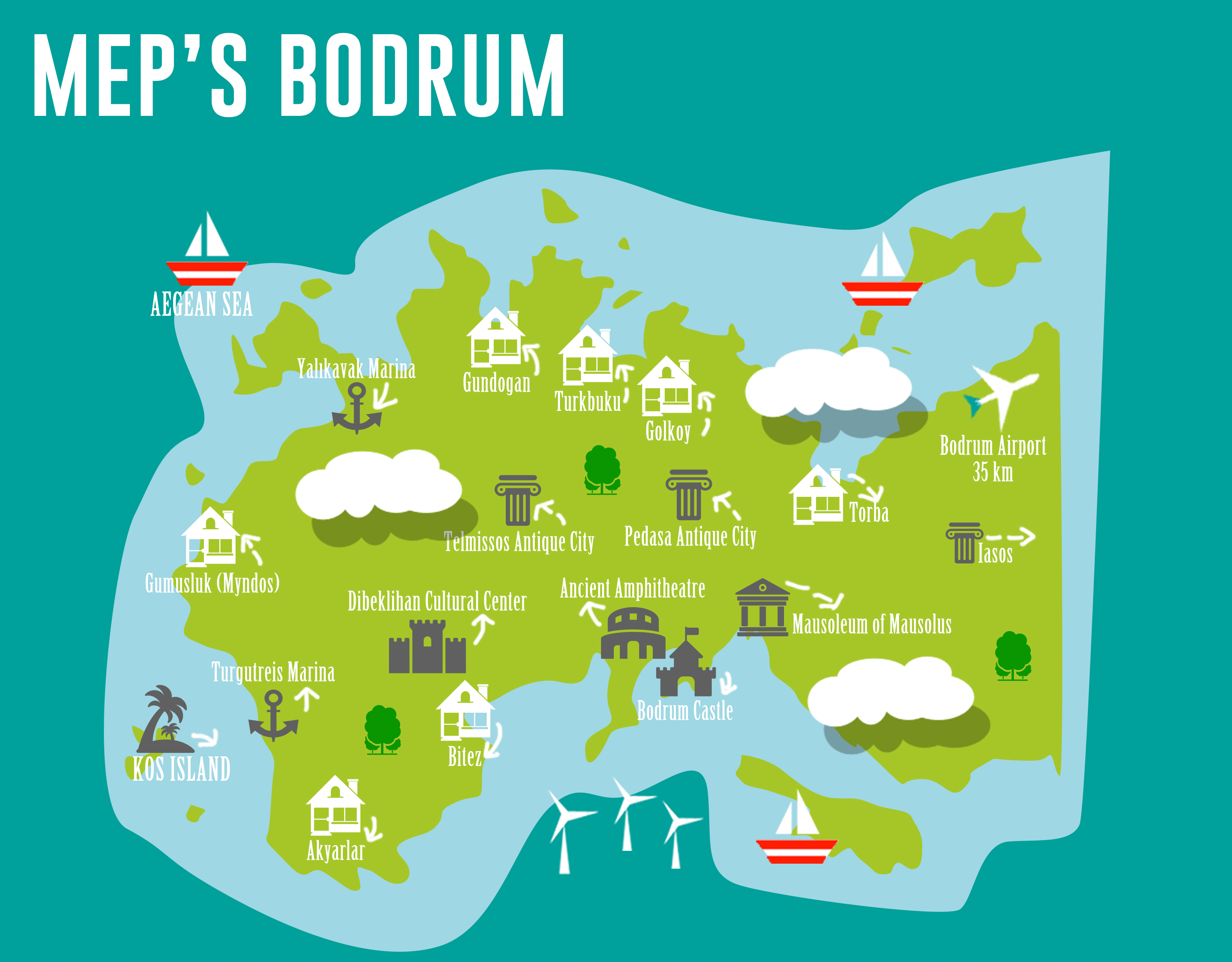 - A charming fishing village with traditional restaurants and beach clubs, located on the site of the ancient city of Myndos.